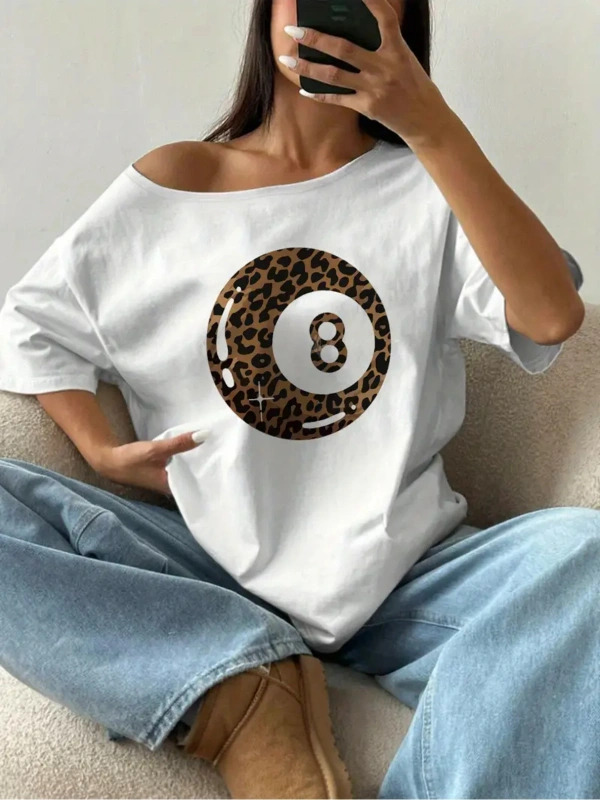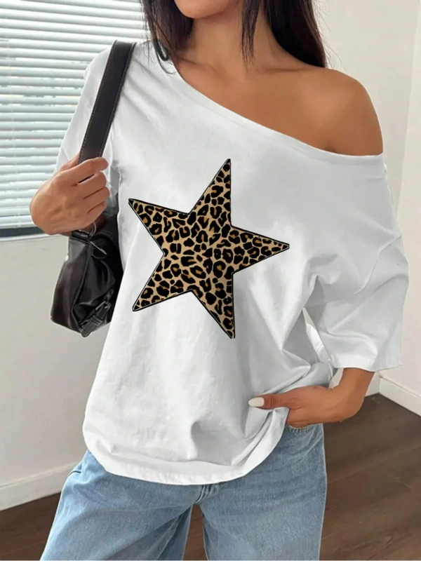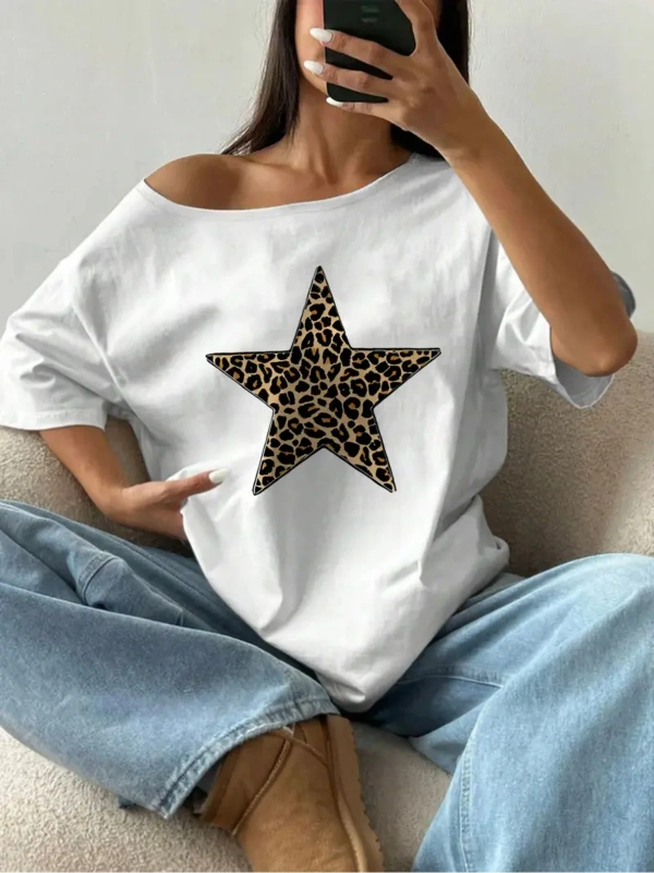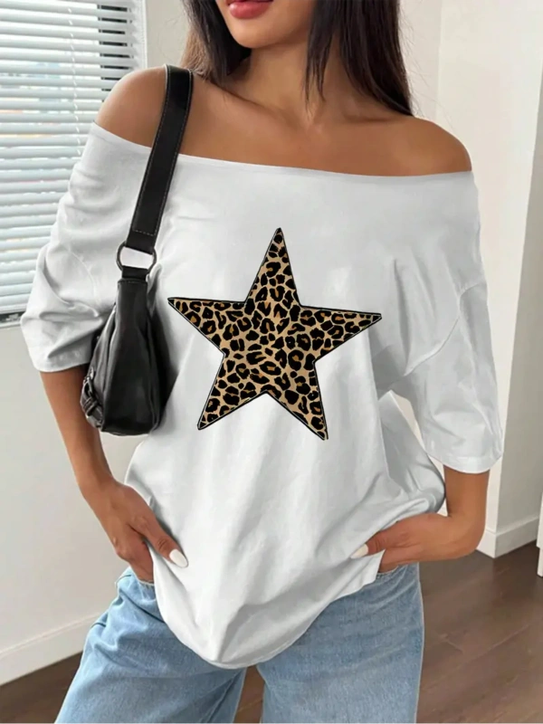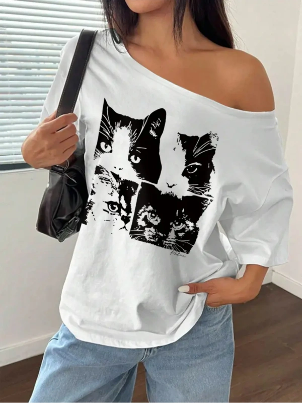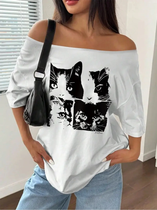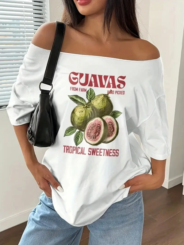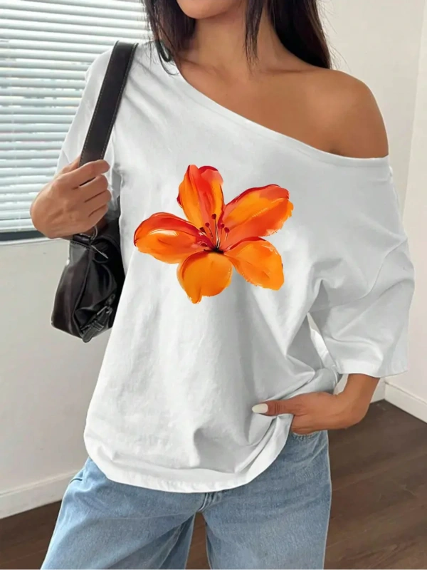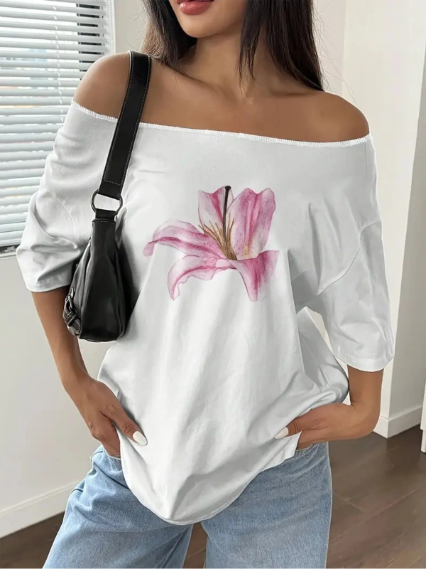 Beyaz Kadın Düşük Omuz Kayık Yaka Baskılı