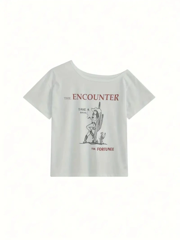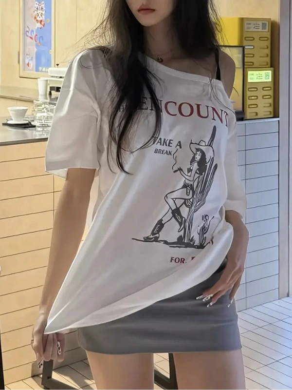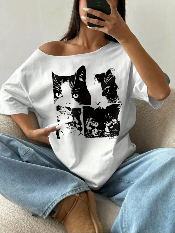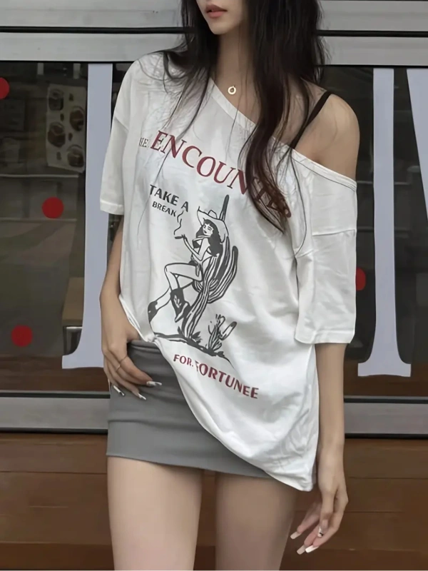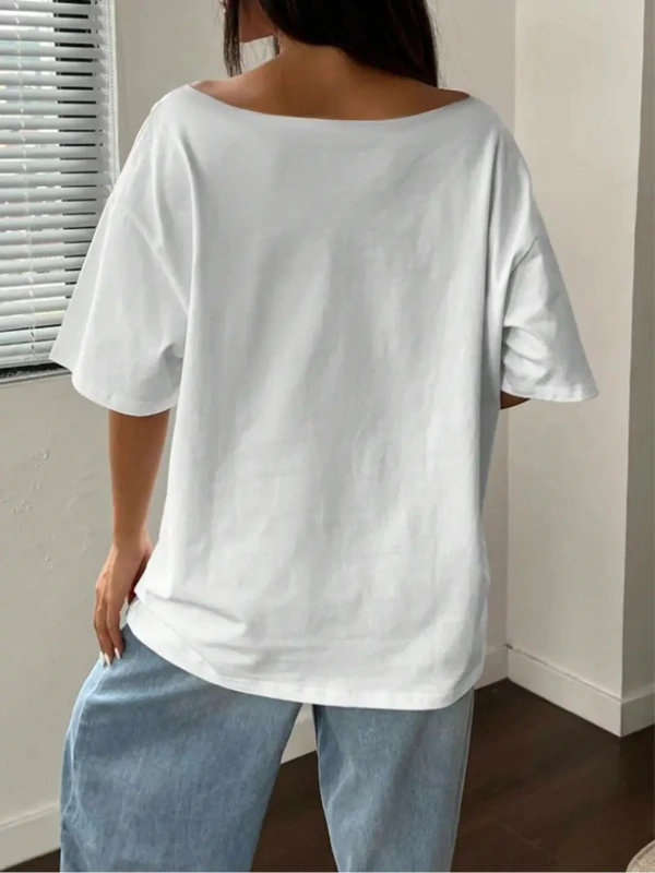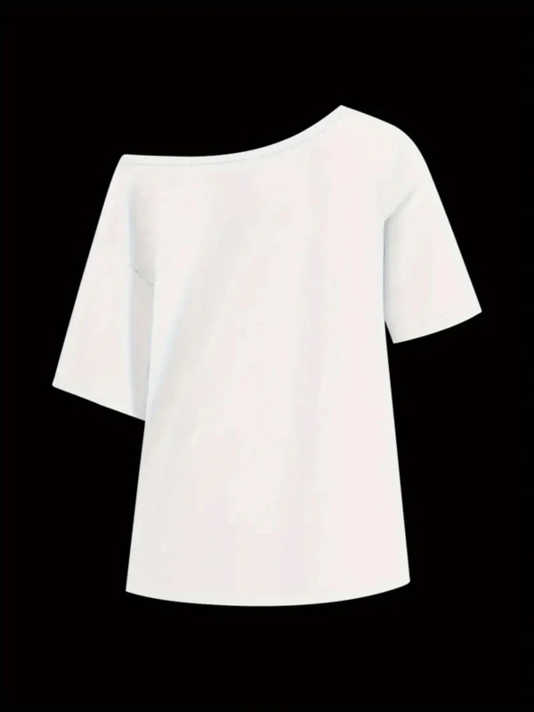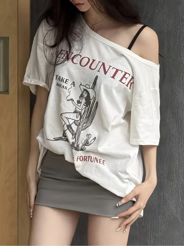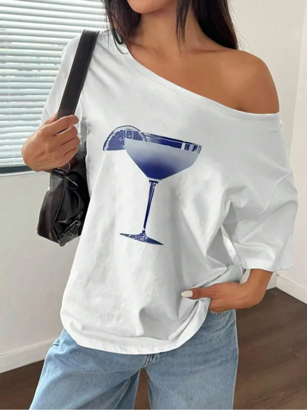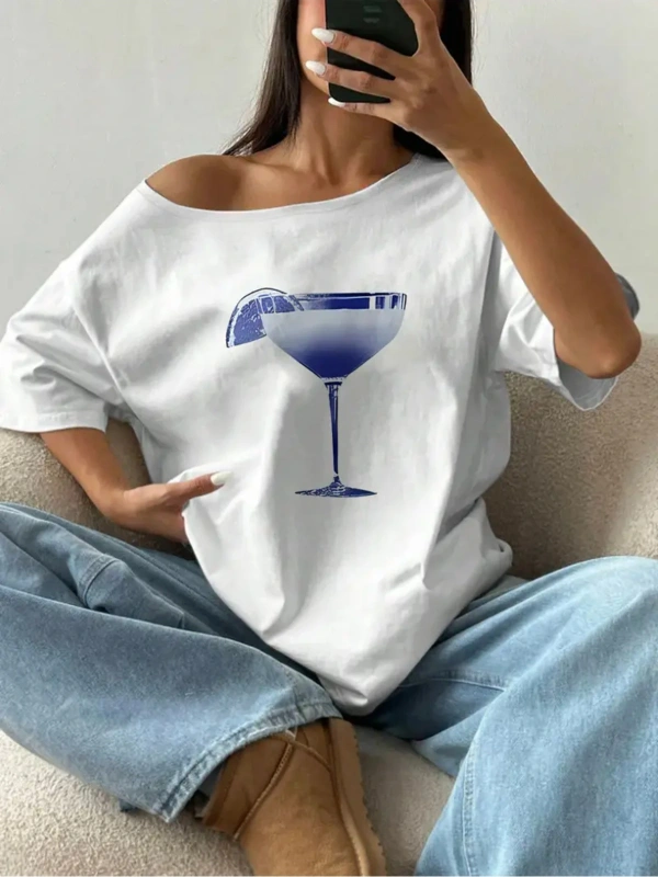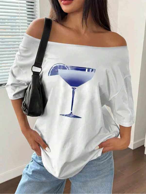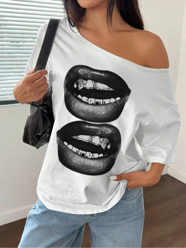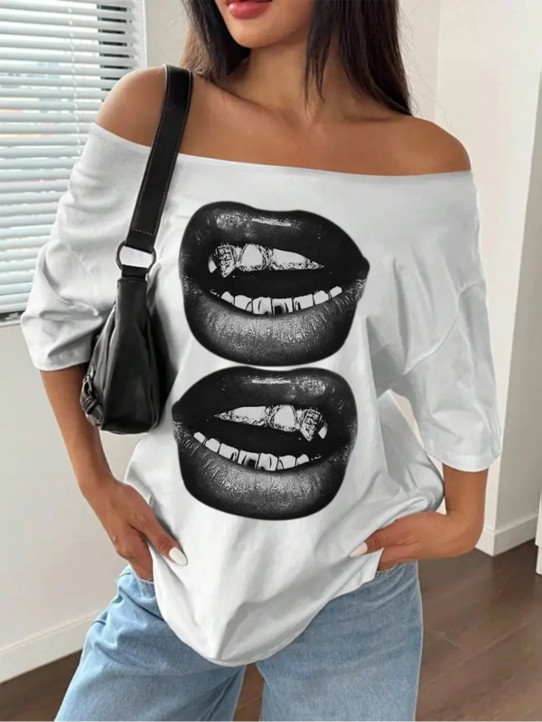 Beyaz Kadın Düşük Omuz Kayık Yaka Bla Bla Baskılı