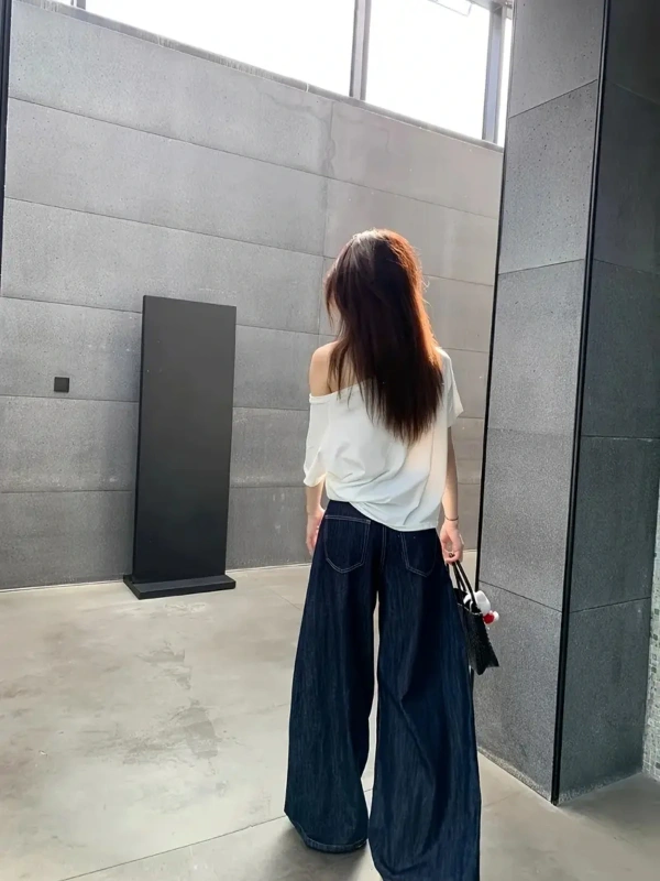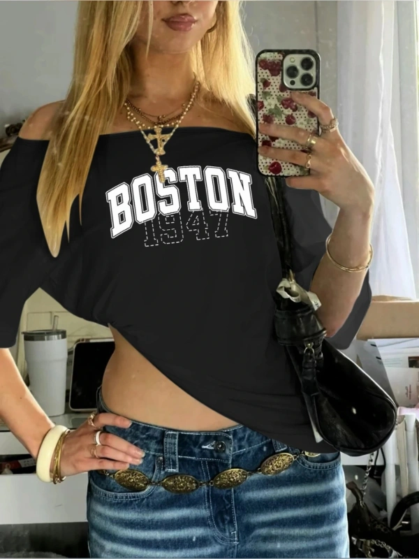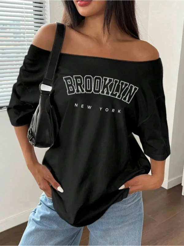 Beyaz Kadın Düşük Omuz Kayık Yaka Brooklyn 98 Baskılı
