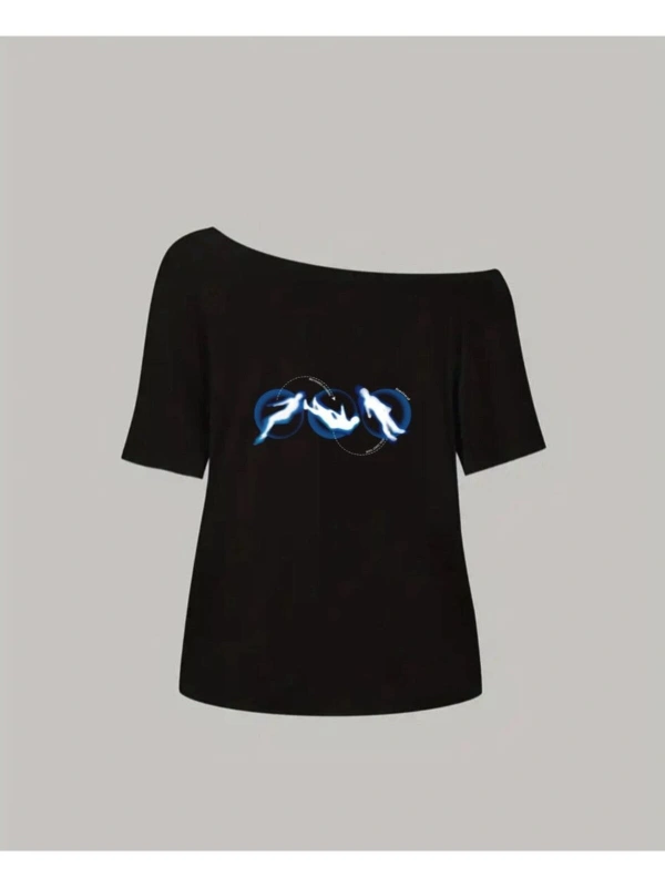 Siyah Kadın Düşük Omuz Kayık Yaka Baskılı