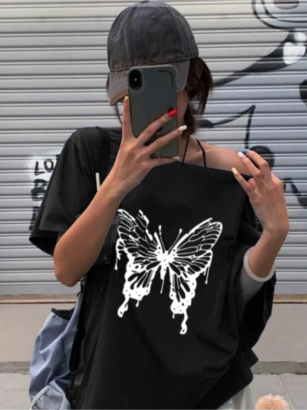 Siyah Kadın Düşük Omuz Kayık Yaka Beyaz Kelebek Baskılı
