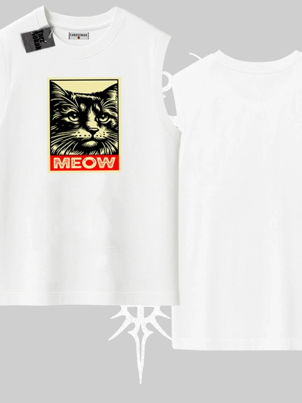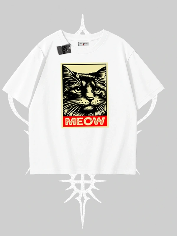Meow Yazılı Kedi Portre Baskılı Oversize Tshirt