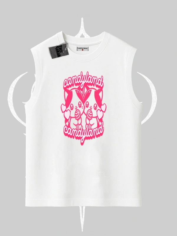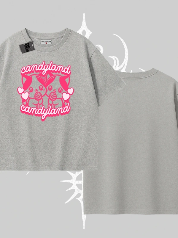 Candyland Yazılı Sevimli Kedi Baskılı Oversize Tshirt