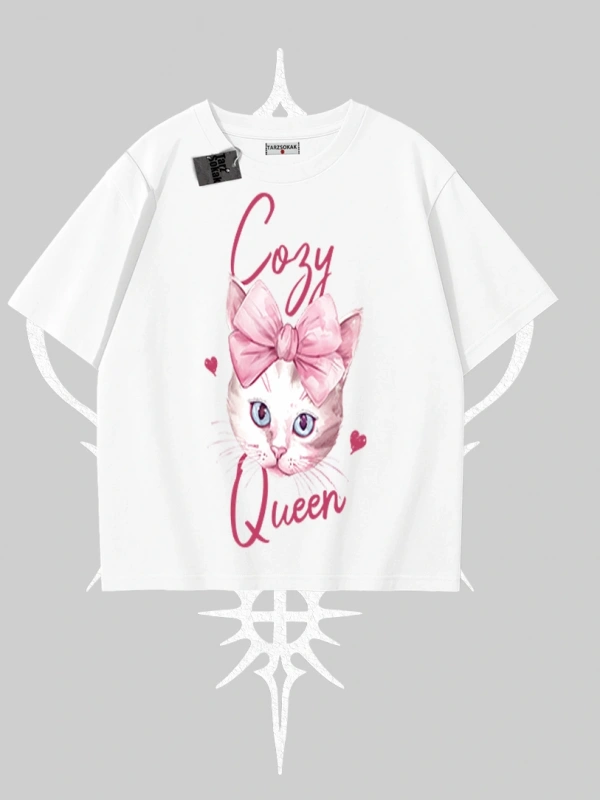 Cozy Queen Kedi Baskılı Oversize Tshirt