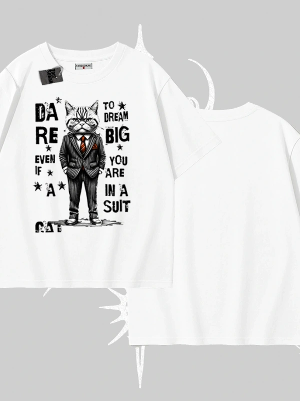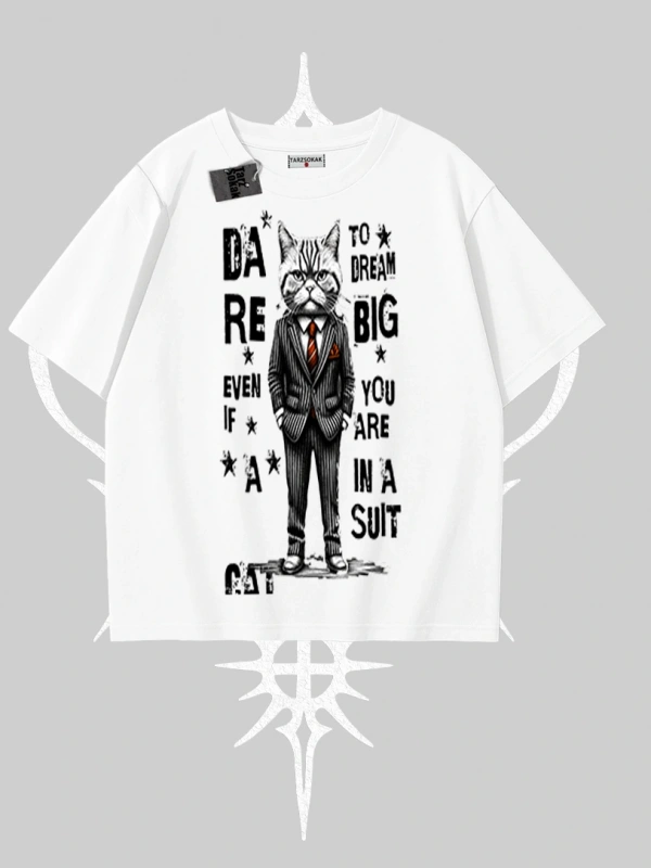 Dream Big Yazılı Takım Elbiseli Kedi Baskılı Oversize Tshirt