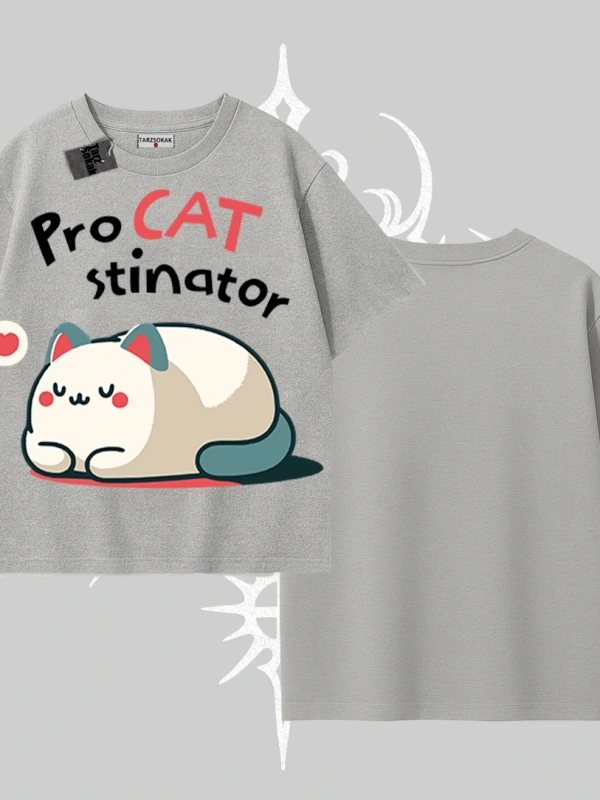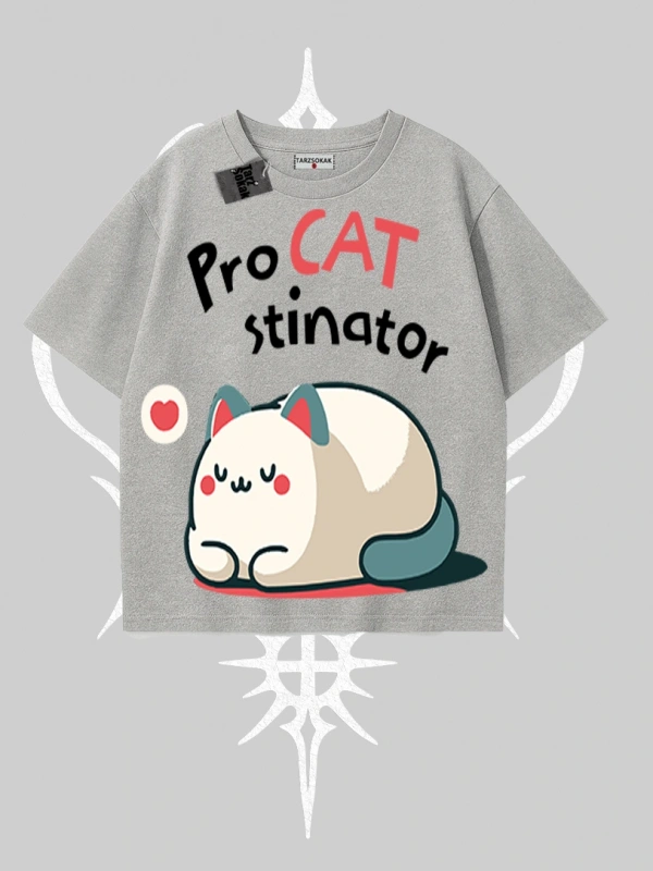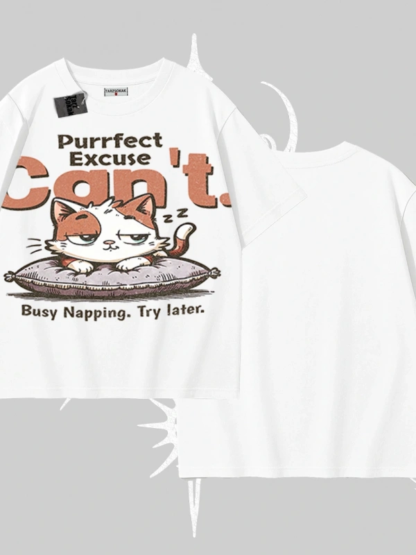 Kedi Baskılı Cant Busy Napping Y2K Oversize Tshirt