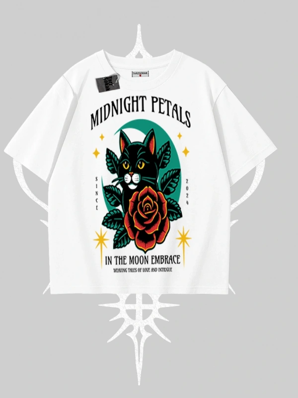 Midnight Petals Kedi Baskılı Oversize Tshirt