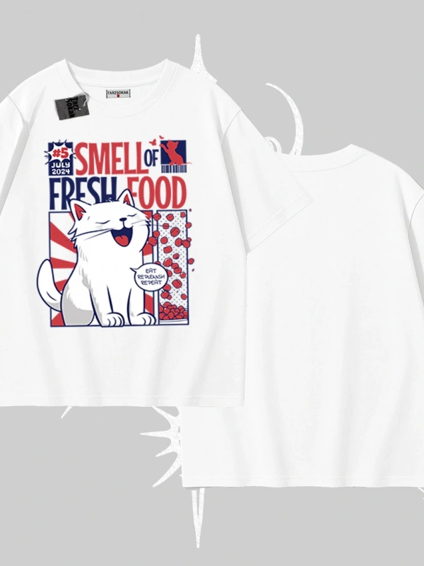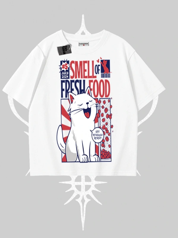 Smell of Fresh Food Kedi Baskılı Oversize Tshirt