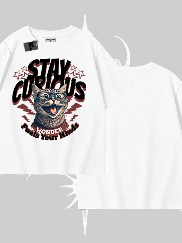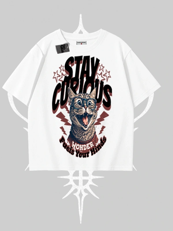 Stay Curious Kedi Baskılı Oversize Tshirt
