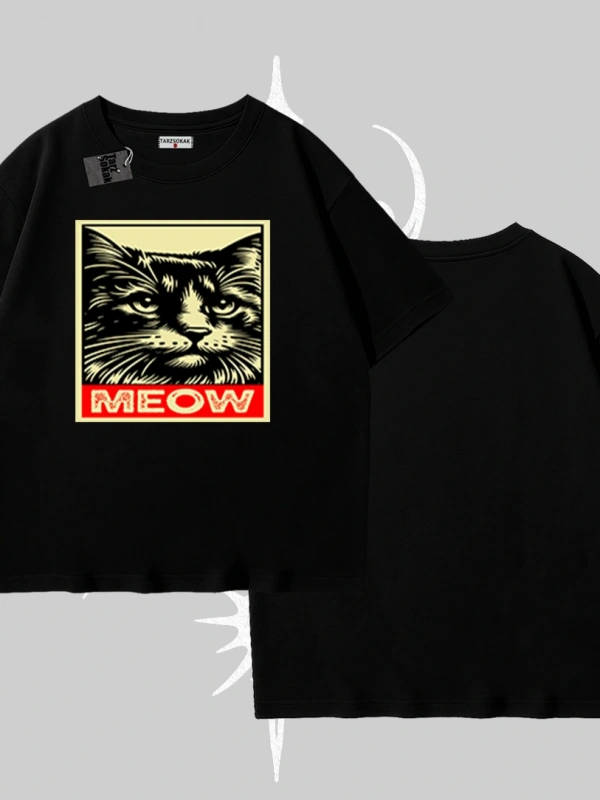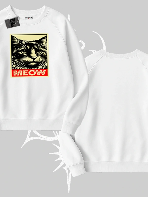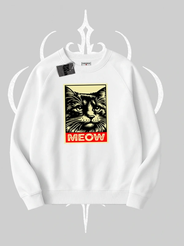 Meow Yazılı Kedi Portre Baskılı Biskilet Sweatshirt
