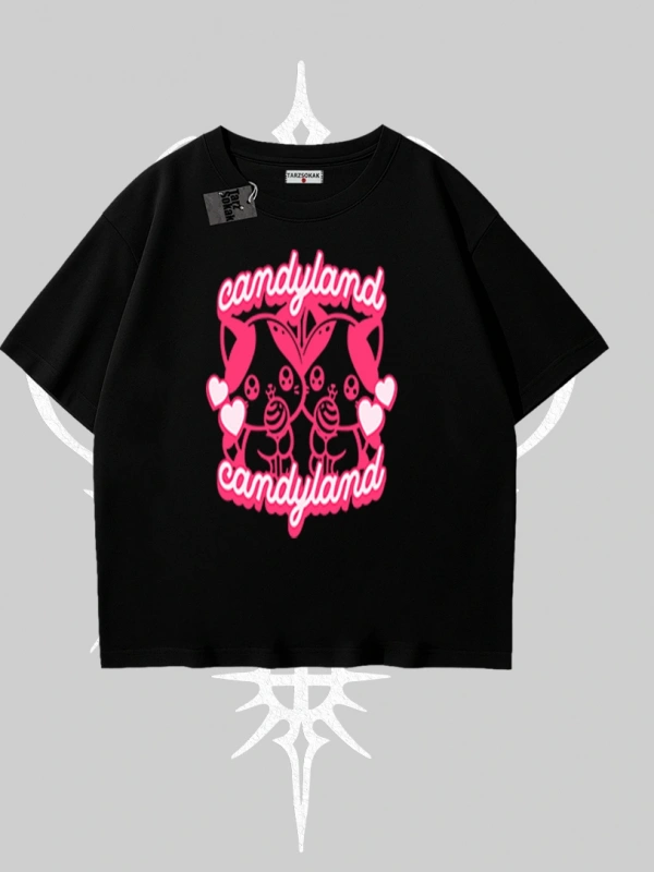 Candyland Yazılı Sevimli Kedi Baskılı Biskilet Sweatshirt