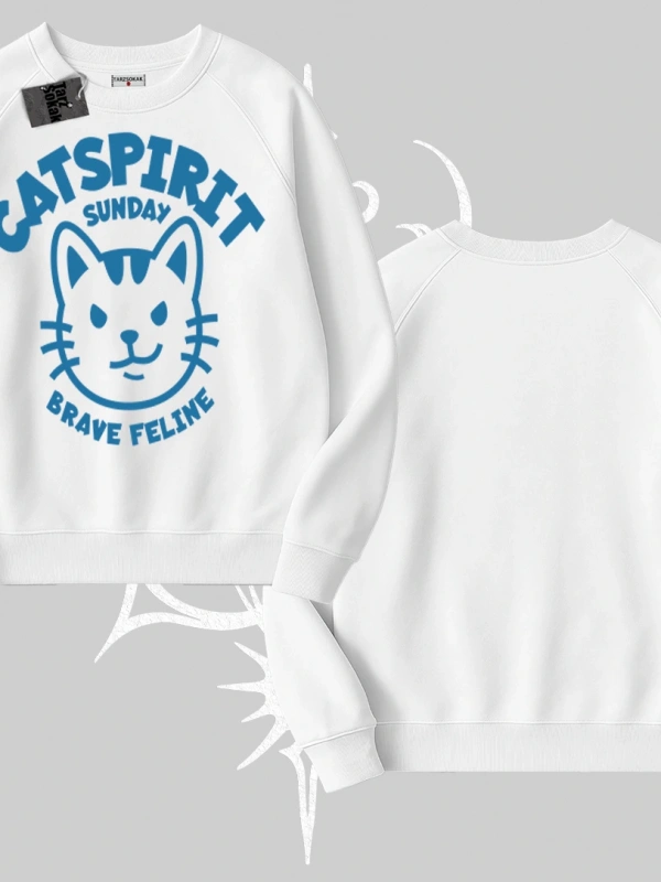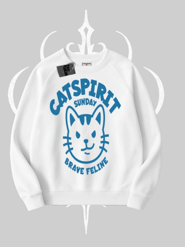 Catspirit Sunday Brave Feline Yazılı Kedi Baskılı Biskilet Sweatshirt