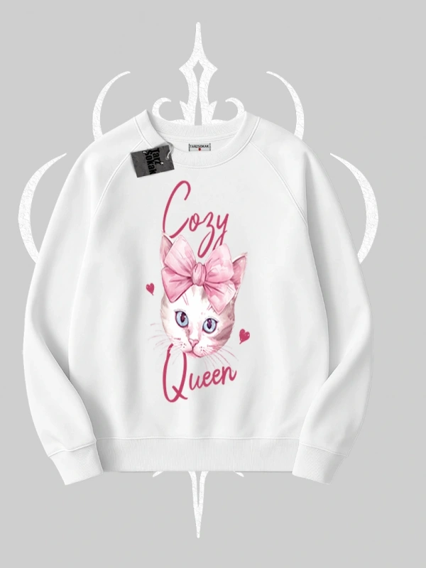 Cozy Queen Kedi Baskılı Biskilet Sweatshirt