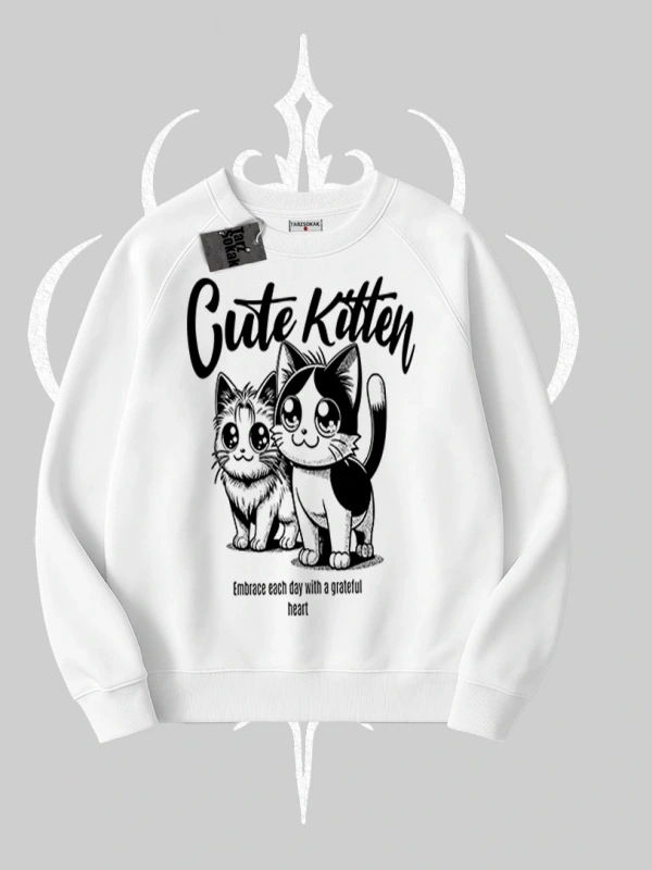 Cute Kitten Yazılı Sevimli Kedi Baskılı Biskilet Sweatshirt