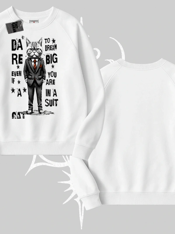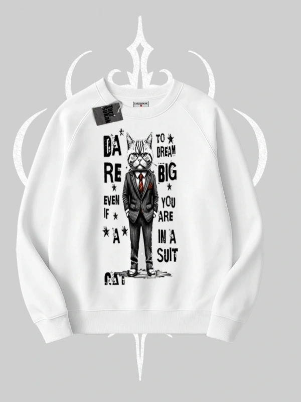 Dream Big Yazılı Takım Elbiseli Kedi Baskılı Biskilet Sweatshirt