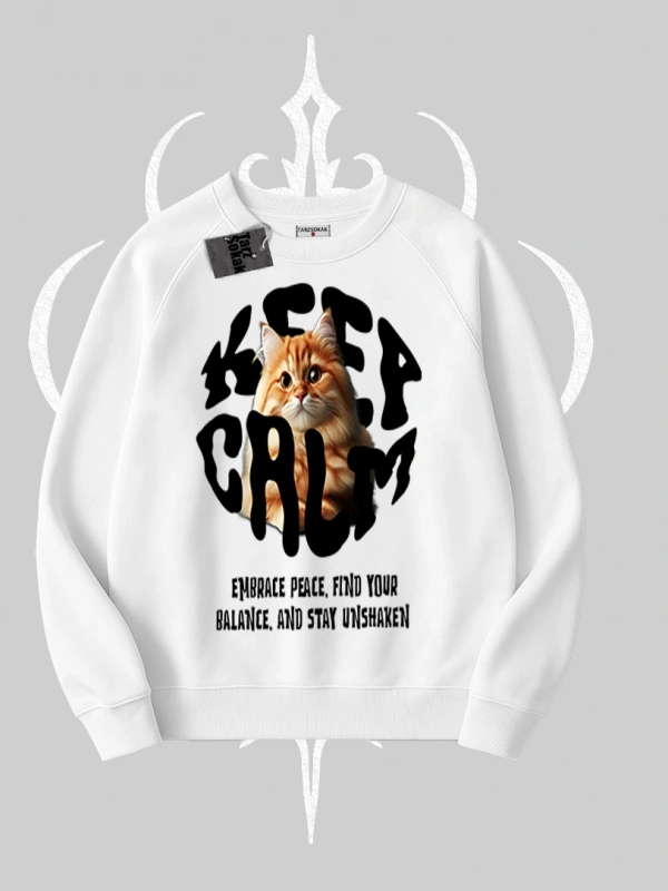 Keep Calm Yazılı Kedi Baskılı Streetwear Biskilet Sweatshirt