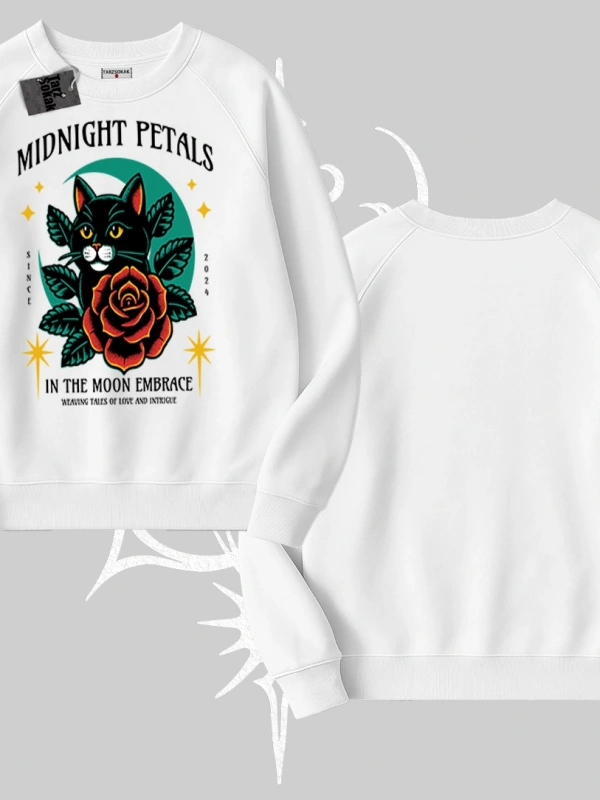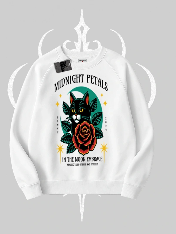 Midnight Petals Kedi Baskılı Biskilet Sweatshirt