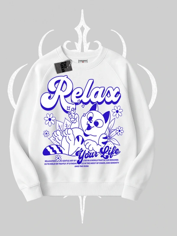Relax Kedi Baskılı Biskilet Sweatshirt