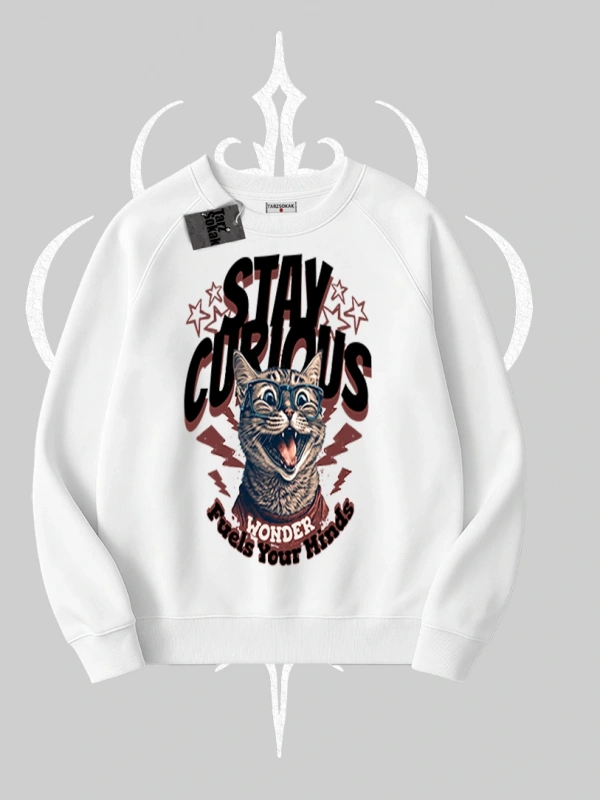Stay Curious Kedi Baskılı Biskilet Sweatshirt
