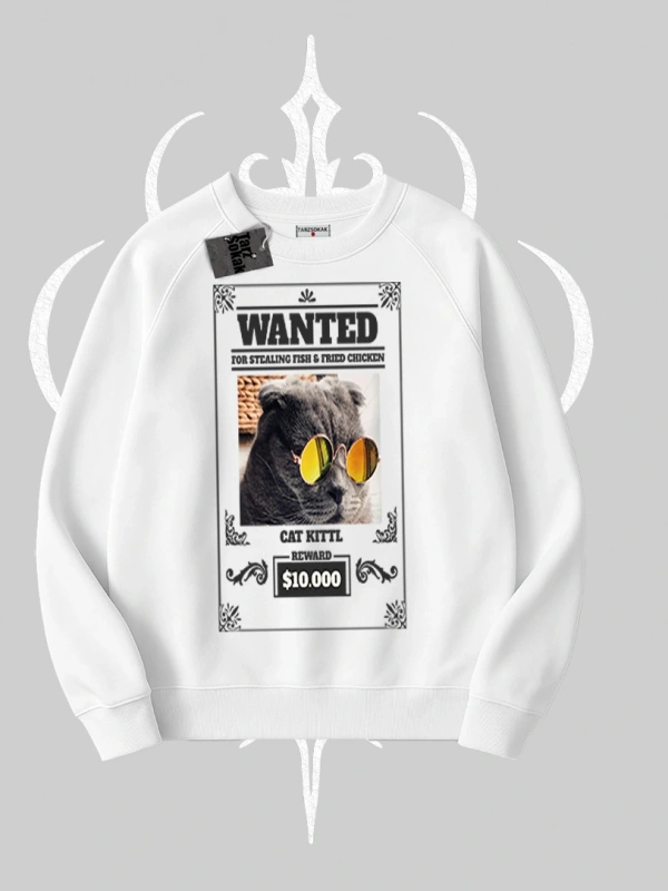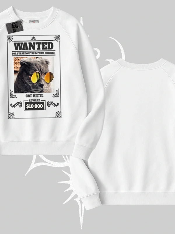 Wanted Temalı Kedi Baskılı Biskilet Sweatshirt