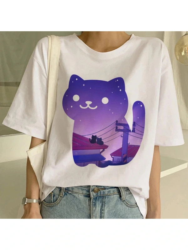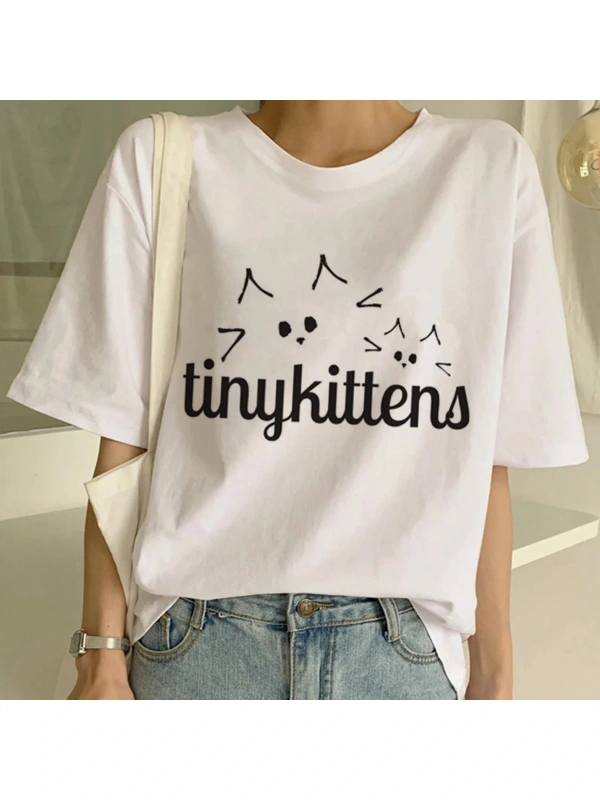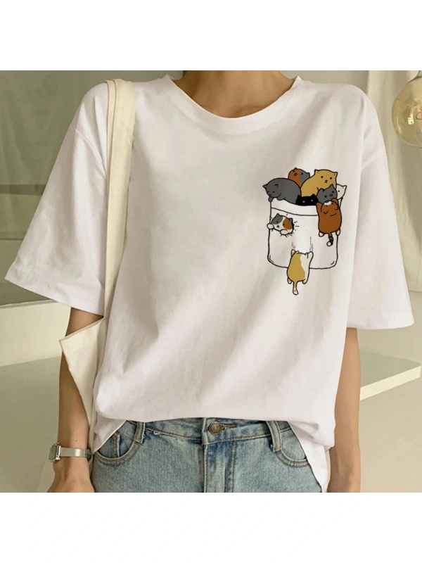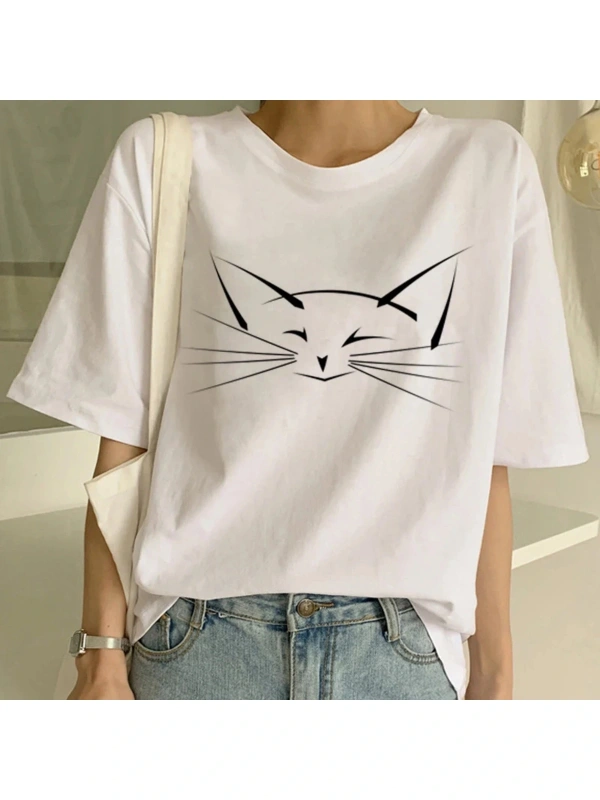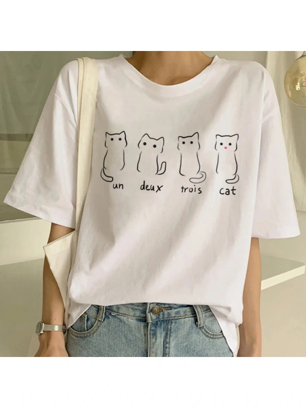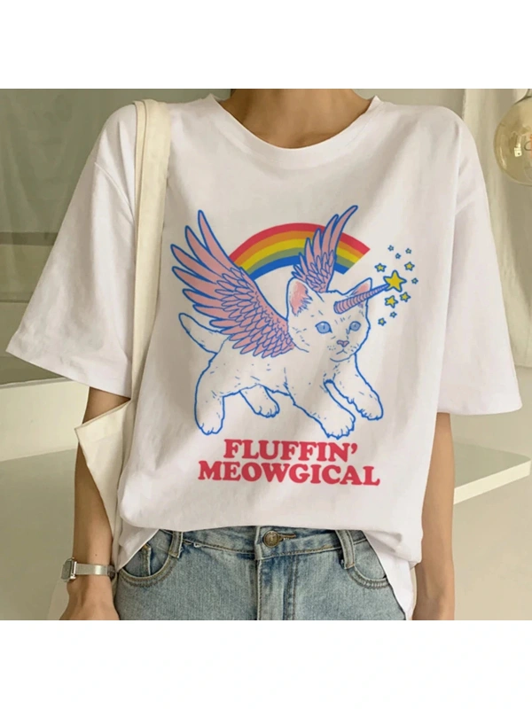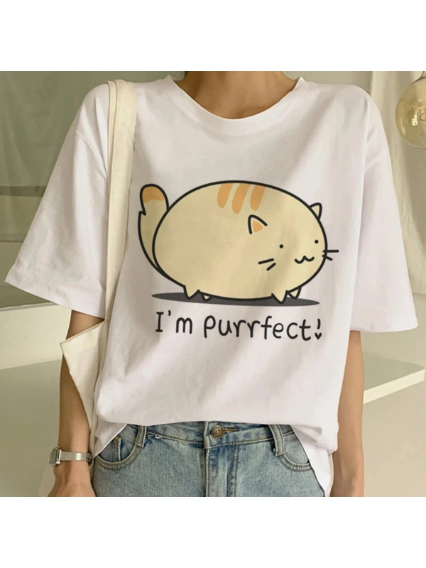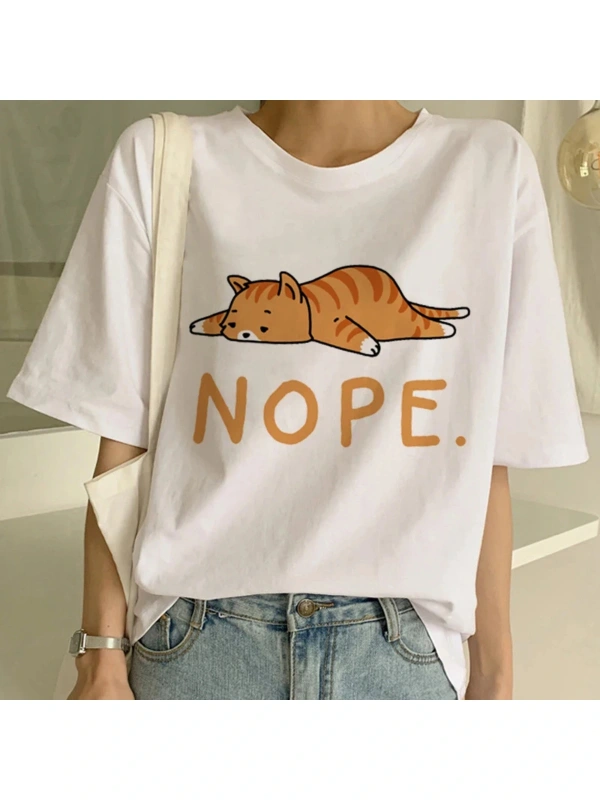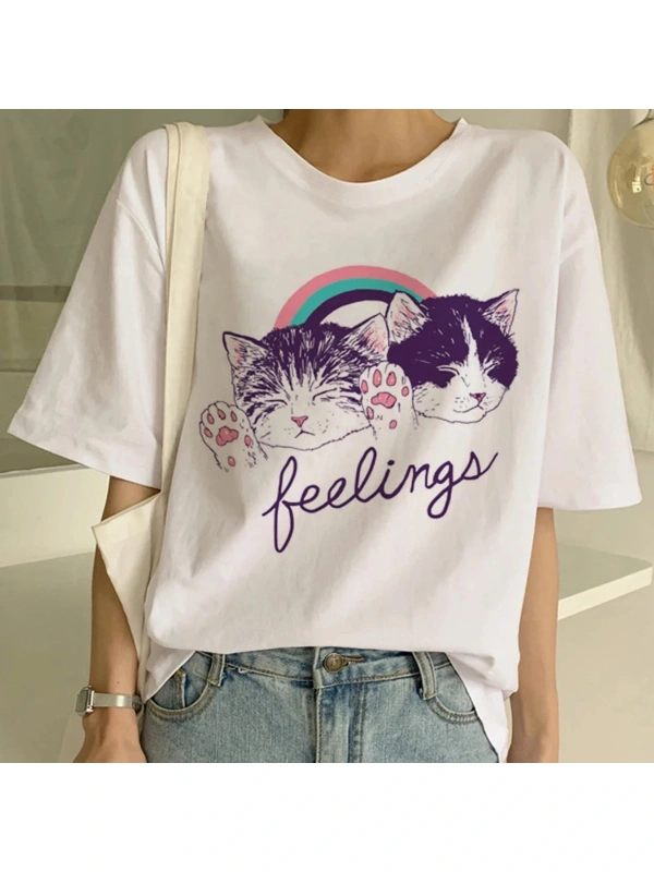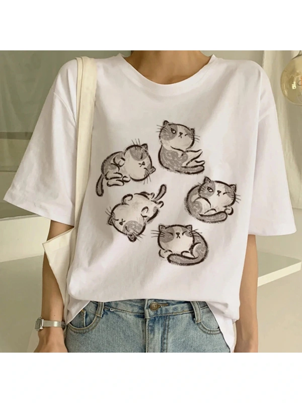 Beyaz Yeni Sevimli Kedi Komik Karikatür Baskı Tshirt Harajuku Kawaii T-shi