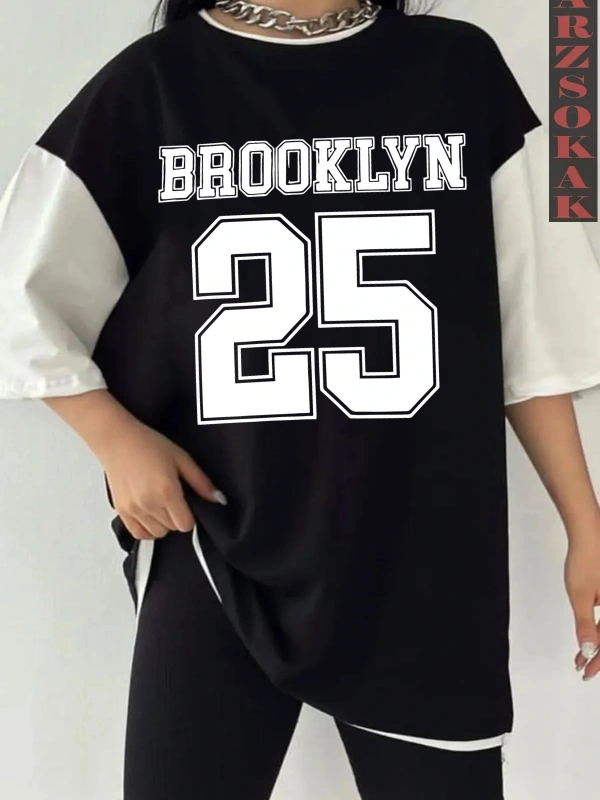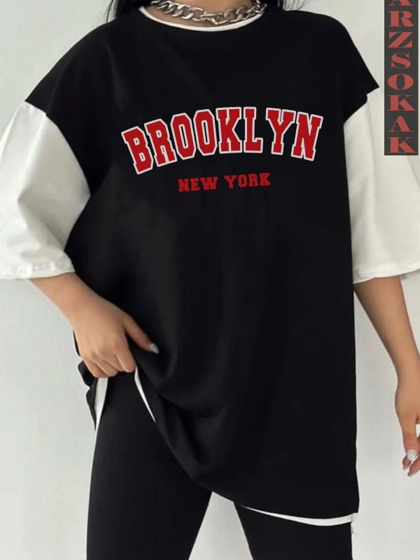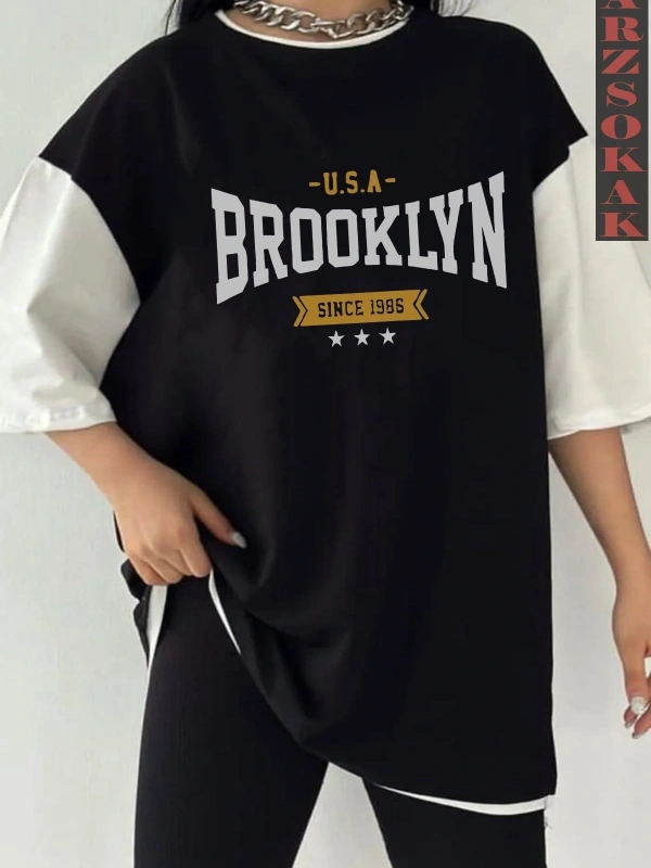 Siyah Oversize Çift Renk BROOKLYN Baskılı Unisex Tshirt