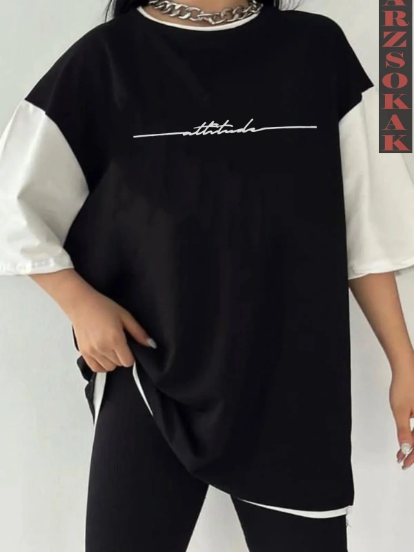 Siyah Oversize Çift Renk ATTİUDE Baskılı Unisex Tshirt