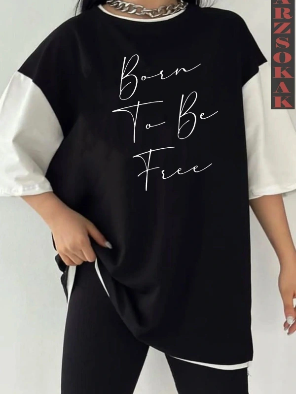 Siyah Oversize Çift Renk FREEDOM YAZI Baskılı Unisex Tshirt