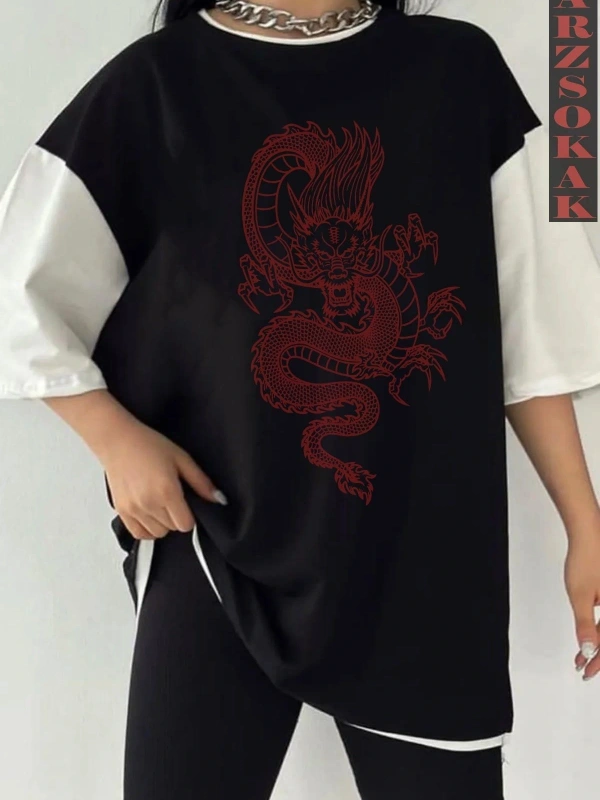 Siyah Oversize Çift Renk EJDERHA Baskılı Unisex Tshirt