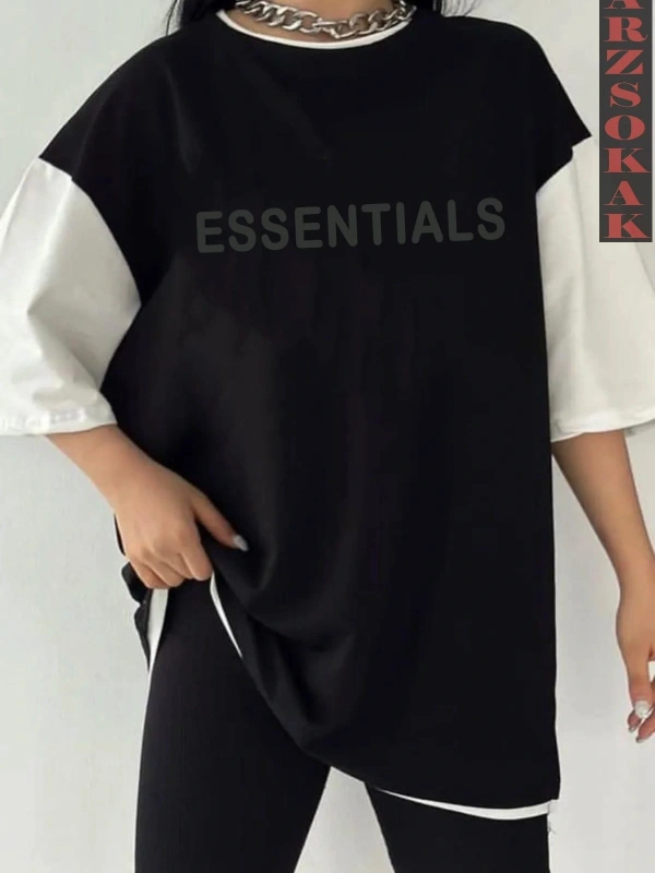 Siyah Oversize Çift Renk ESSENTİALS YAZI Baskılı Unisex Tshirt