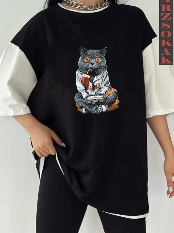 Siyah Oversize Çift Renk KEDİ CAT YAZI Baskılı Unisex Tshirt