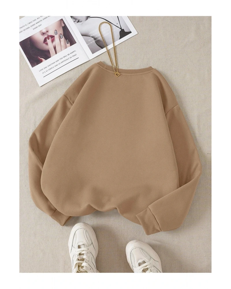 Sloganlı ve Yıldız Desenli Düşük Omuzlu Oversize Sweat Bej