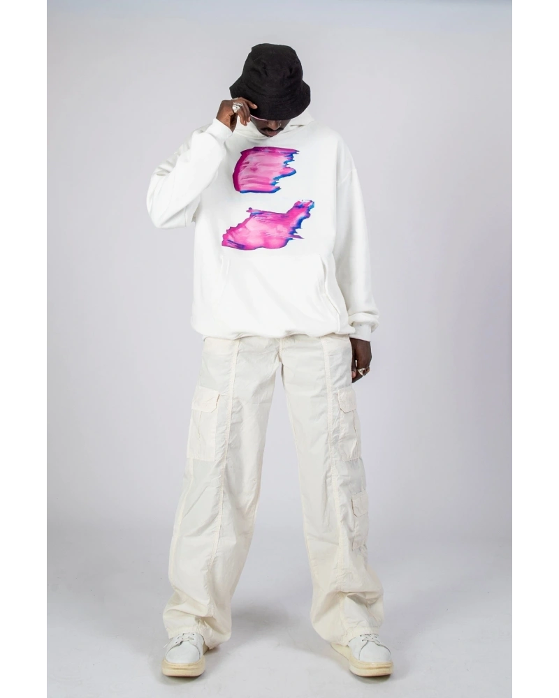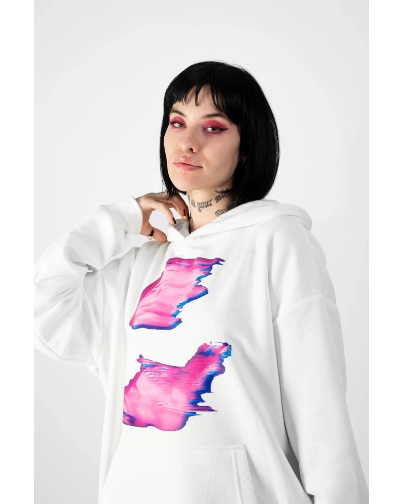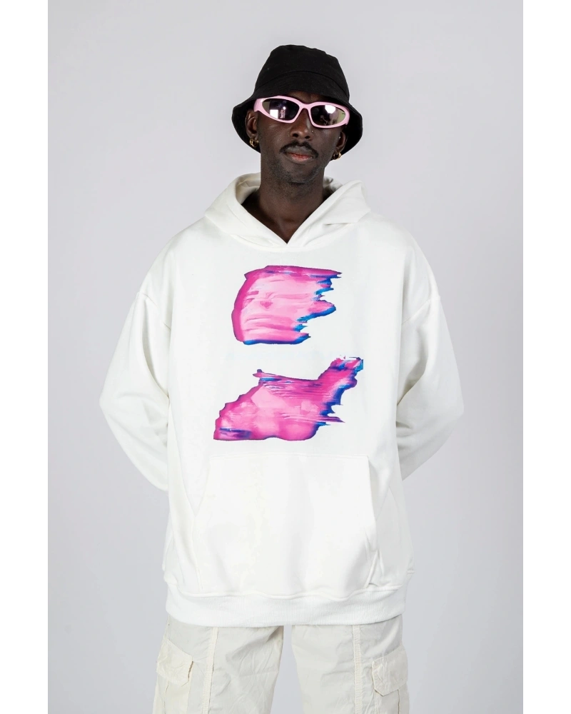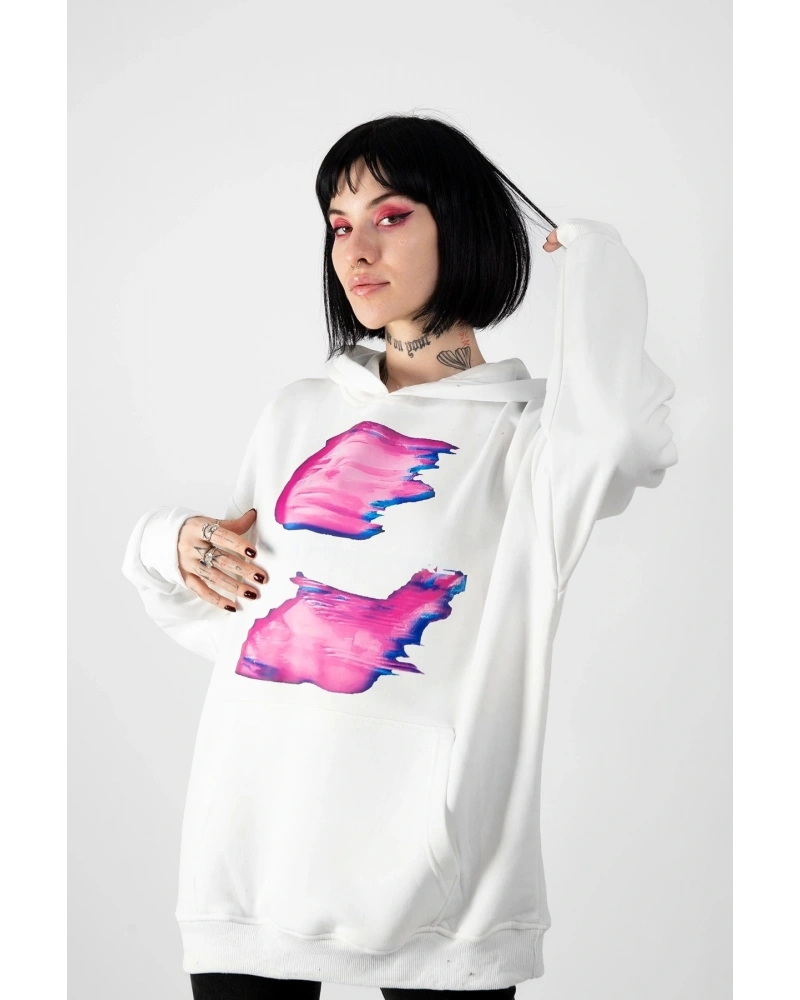 YQYQ----Oversize Mavi Boya Kelebek Temalı Tasarım Baskılı Unisex Kapüşonlu Sweatshirt Hoodie Beyaz