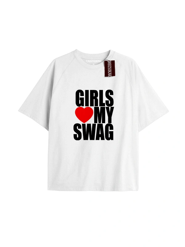 GIRLS LOVE MY SWAG Unisex Oversize Yazılı Tshirt BEYAZ