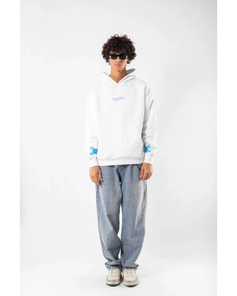 YQYQ----Oversize Mavi Boya Kelebek Temalı Tasarım Baskılı Unisex Kapüşonlu Sweatshirt Hoodie Beyaz