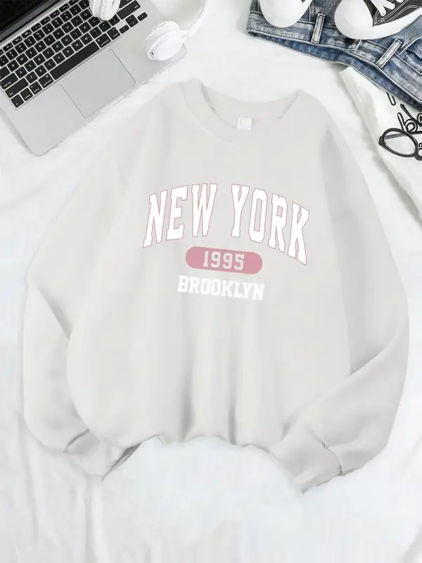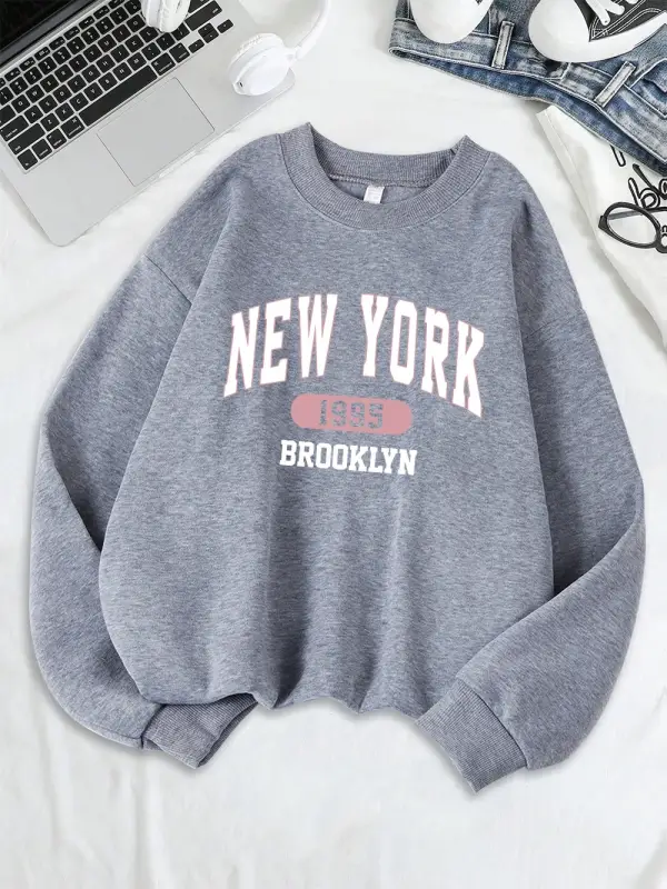 New York Brooklyn 1955 Baskılar Tişörtü Kadın Bisiklet Yaka Rahat Kapüşonlular Gevşek Polar S