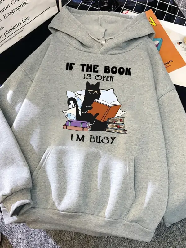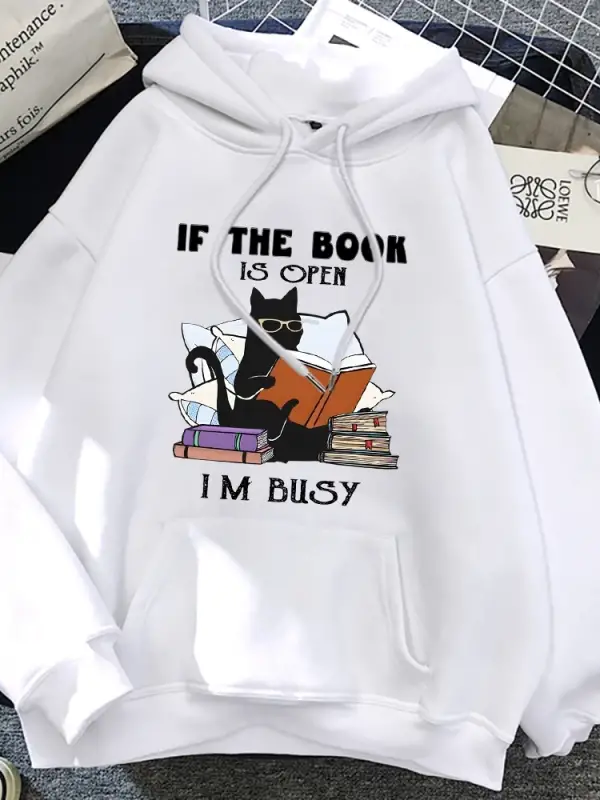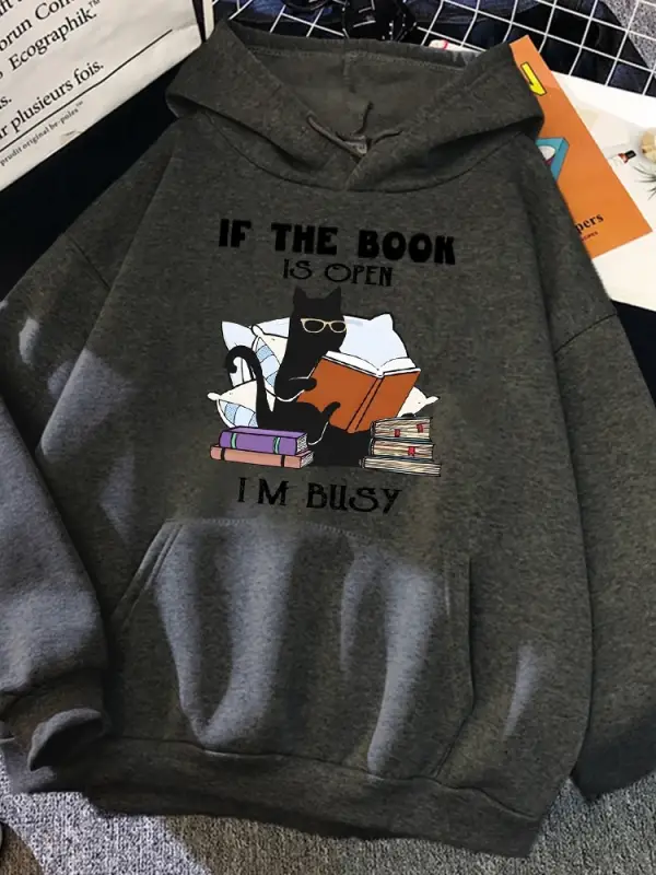 Kitap Açıksa Ben Meşgul Siyah Kedi Hoody Kadın Rahat Bisiklet Yaka Kapüşonlular Moda Bol Giys