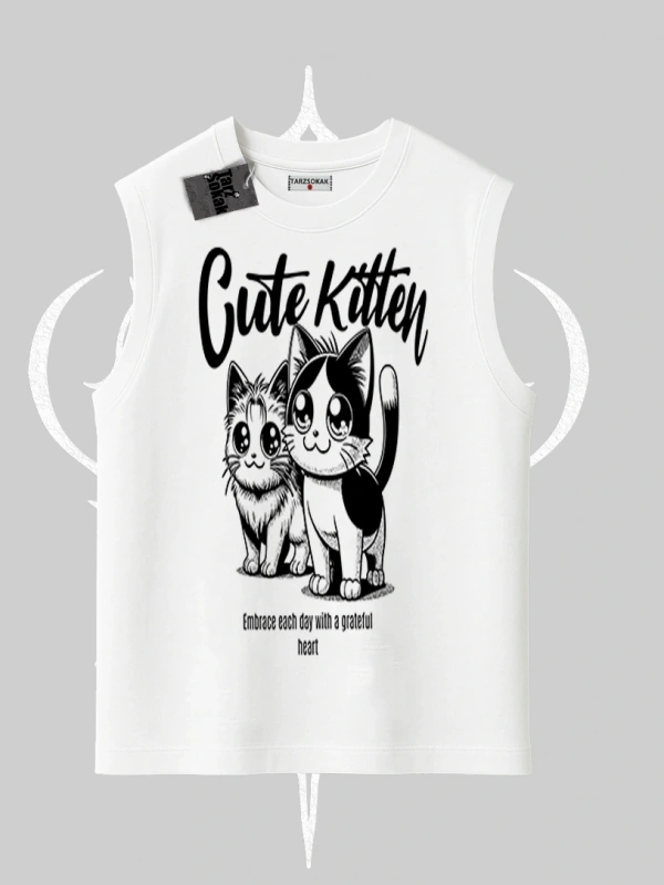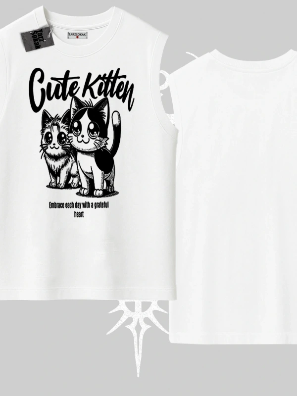 Cute Kitten Yazılı Sevimli Kedi Baskılı Kolsuz Tshirt