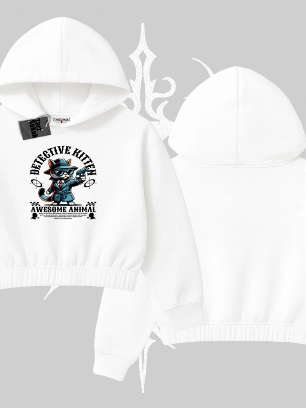 Detective Kitten Kedi Baskılı Kapşonlu Crop Sweatshirt