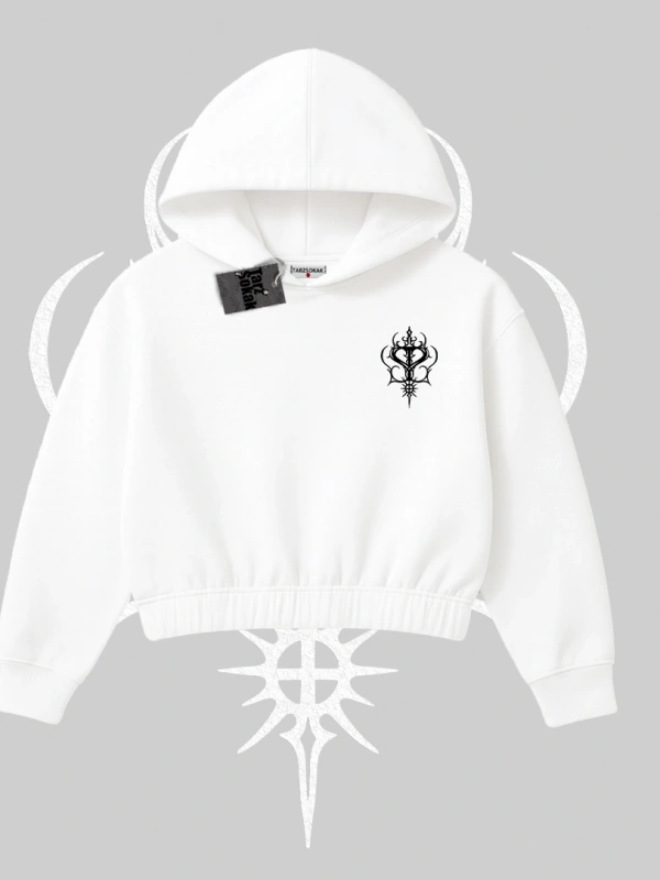 Modern Kedi Temalı Arka Baskılı Kapşonlu Crop Sweatshirt