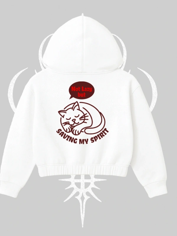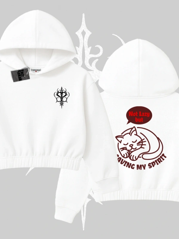 Not Lazy Saving My Spirit Kedi Baskılı Kapşonlu Crop Sweatshirt