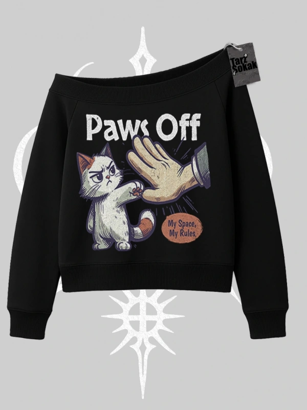 Gotik Kedi Arka Baskılı Kayık Yaka Tshirt
