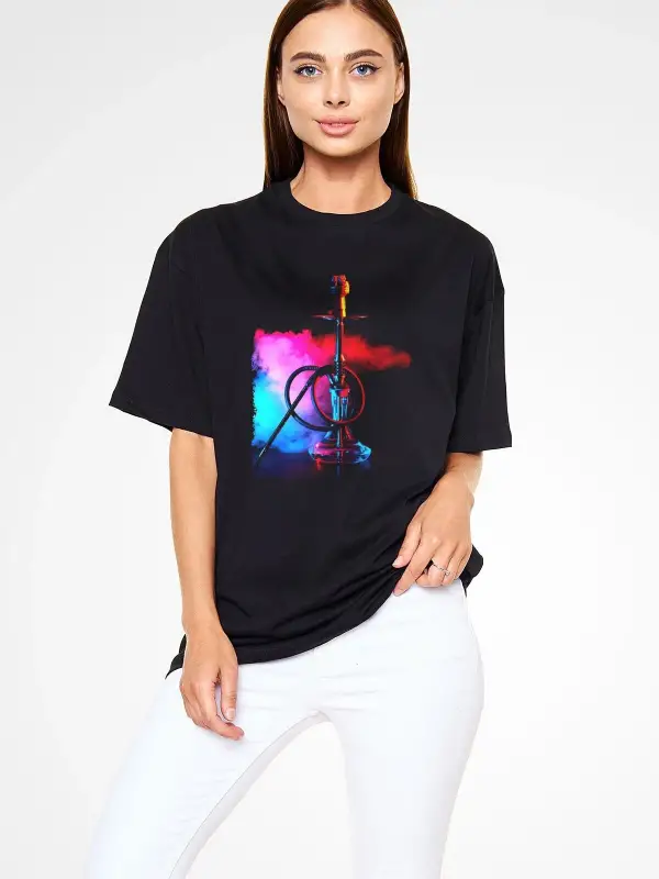 Ko Buta Nargile Baskılı Unisex Siyah Oversize T-shirt Os9944