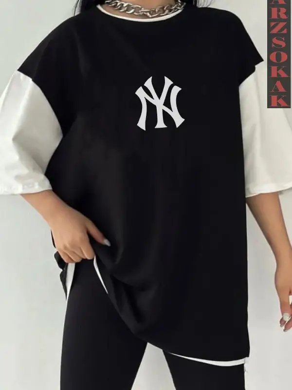 Siyah Oversize Çift Renk NY YANK SESİ YAZI Baskılı Unisex Tshirt
