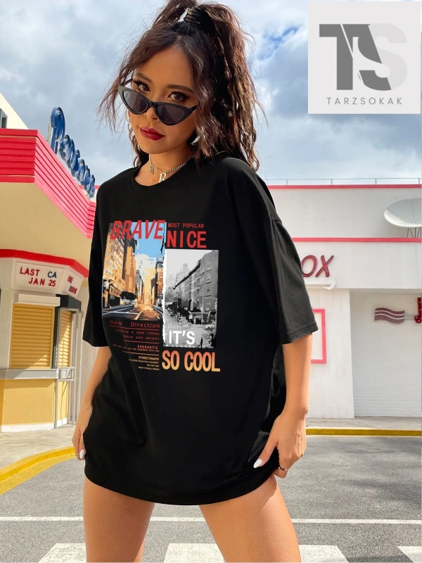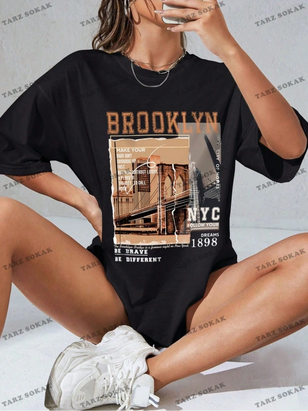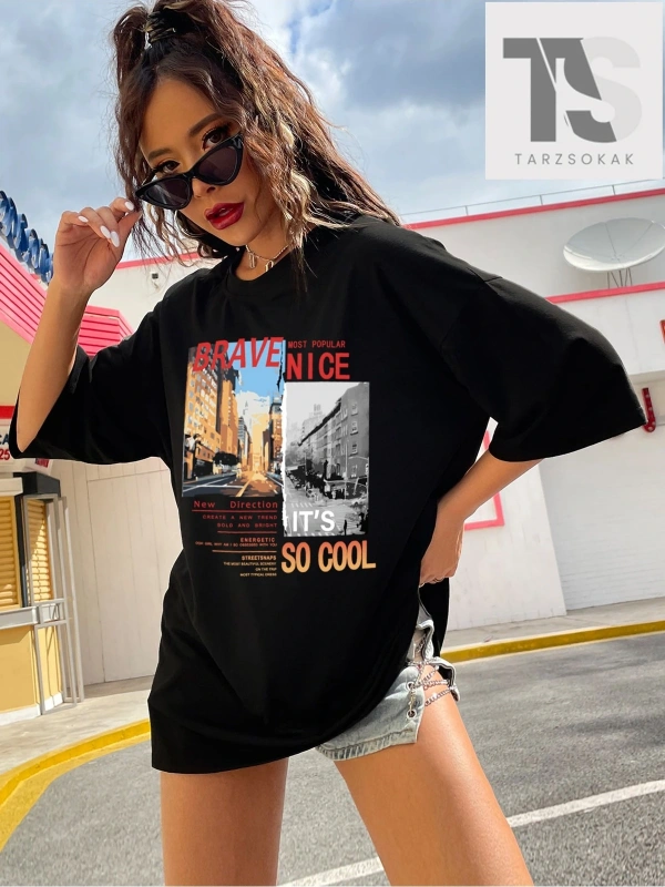 Sokak Görünümü ve Slogan Grafikli Düşük Omuzlu Oversize Tişört
