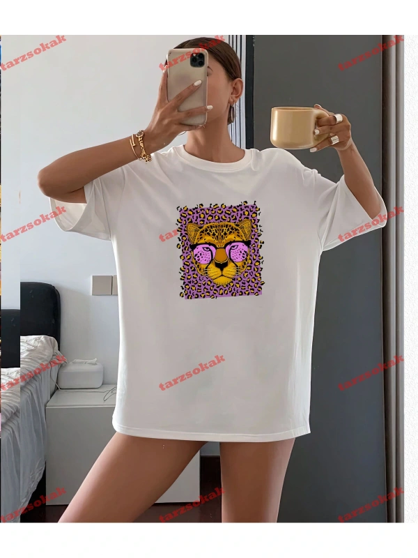 Beyaz Eğlenceli ve Sevimli Kedi ve Köpek Desen Gevşek Tshirt Vintage Üst FemaleT-Shir