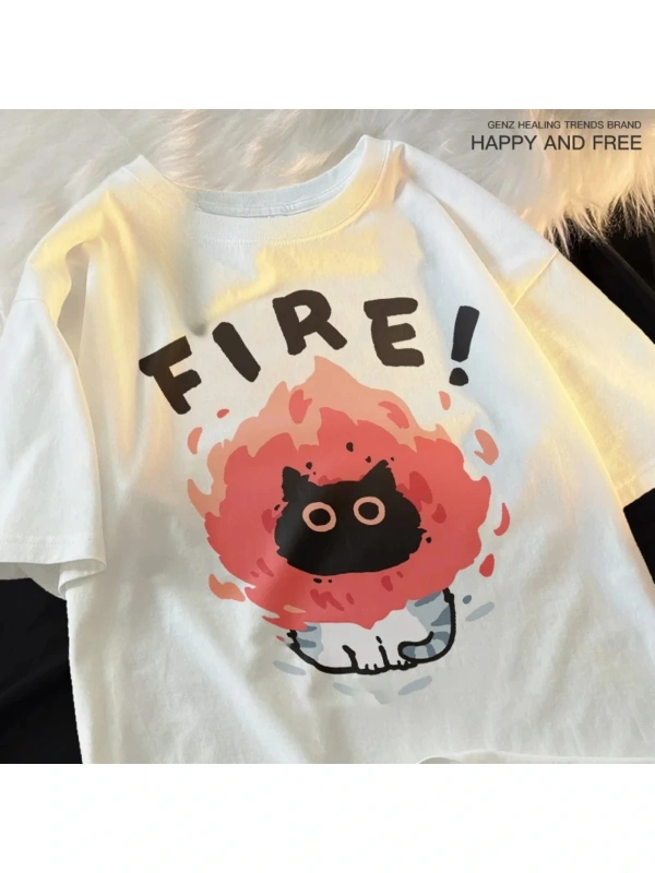 Beyaz Kore Baskılı Retro Tarzı Baskı Gevşek Yaz Yuvarlak Boyun Üst Spor Yum
