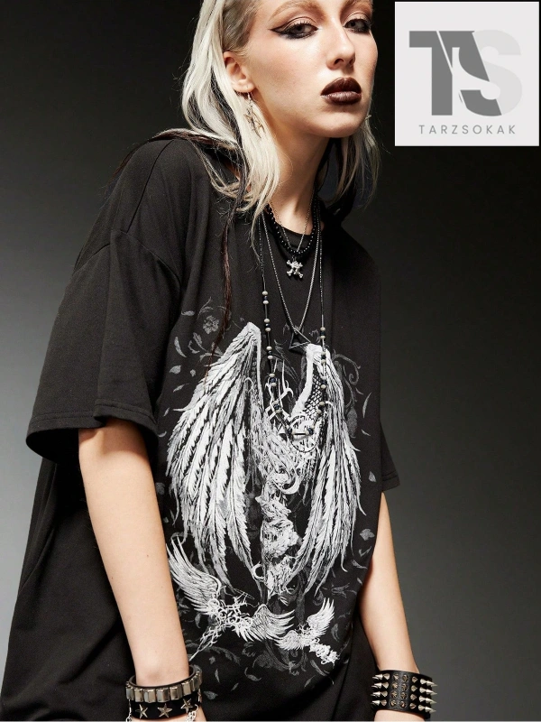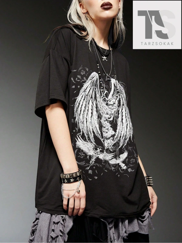 KOD Trend Grunge Punk Erkek Kanat Baskı Yuvarlak Yaka Tişört