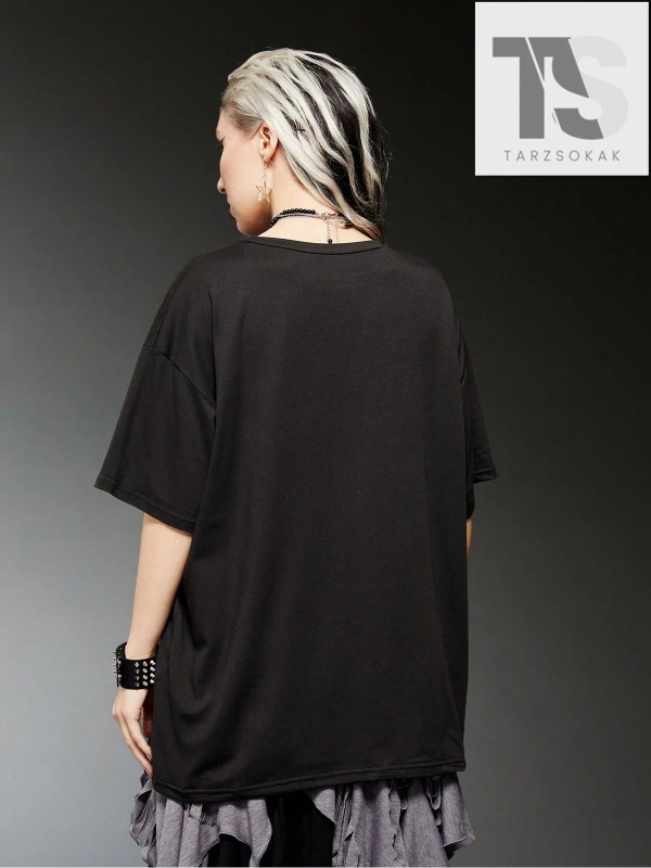 Catsneeze Goth Sloganı Kafatası Grafikli Drop Omuz Tişörtü