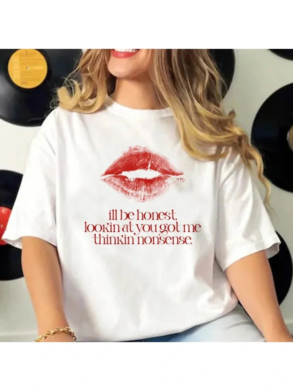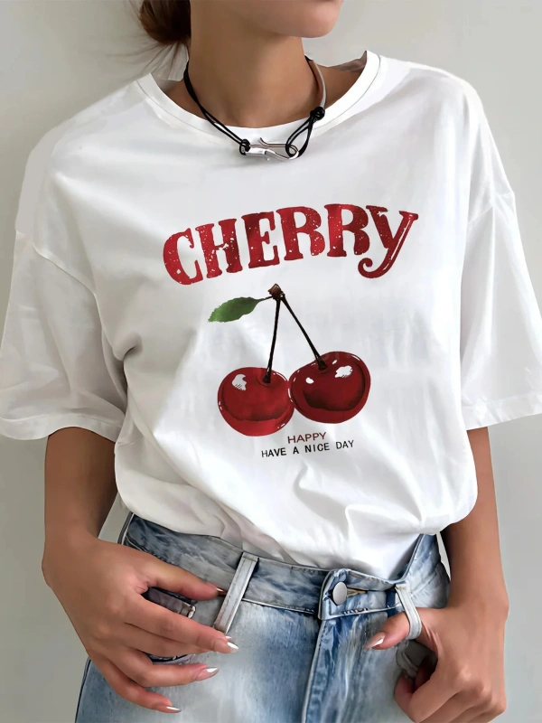 Beyaz Yaz Kiraz Baskı Günlük Beyaz Çok Yönlü Gevşek Yuvarlak Yaka